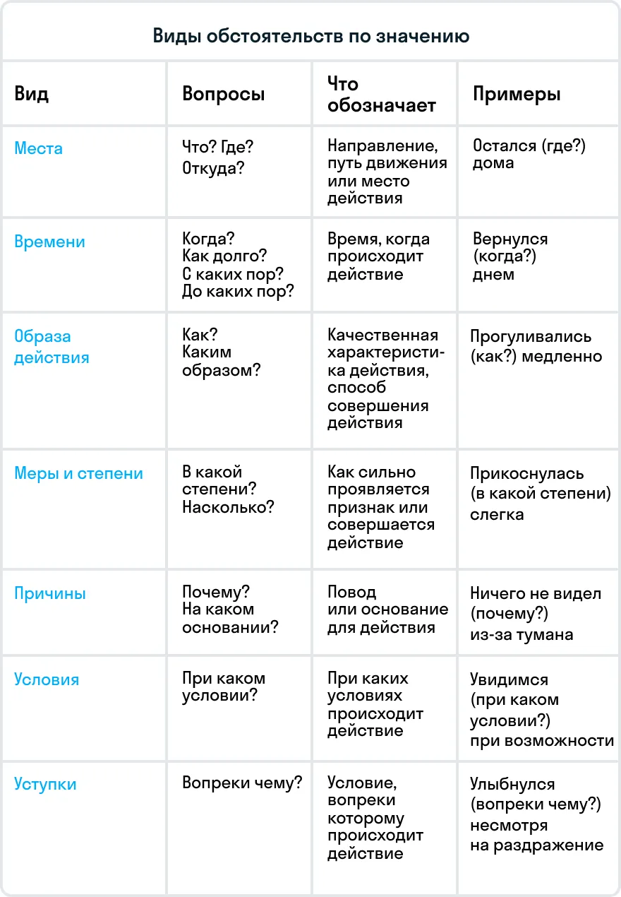 Существует несколько типов обстоятельств: обстоятельства времени, места, причины, цели, условия и образа действия. Каждый из этих типов отвечает на свои вопросы, например, обстоятельства времени отвечают на вопрос «когда?», а обстоятельства места – на вопрос «где?». Изучение этих типов позволяет правильно вписывать их в предложение, чтобы получить полное и грамотно построенное высказывание.