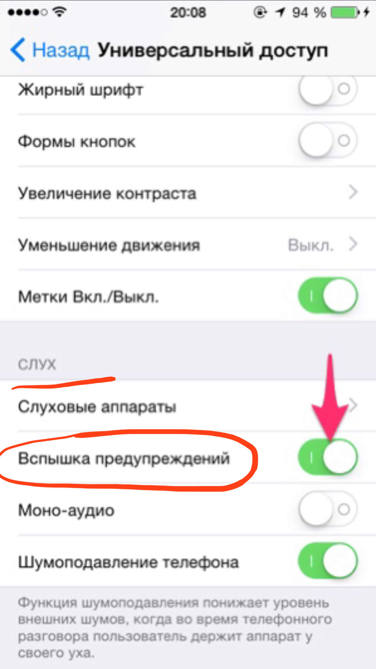 Отключение вспышки через параметры доступности